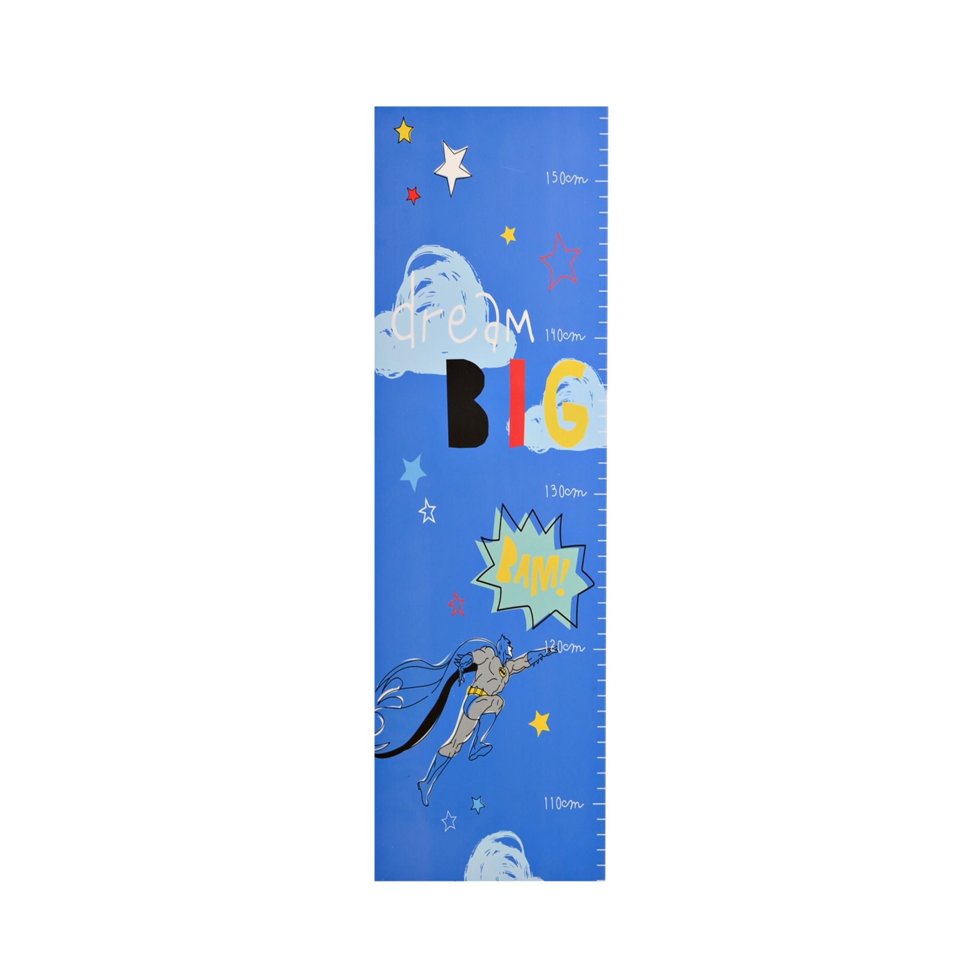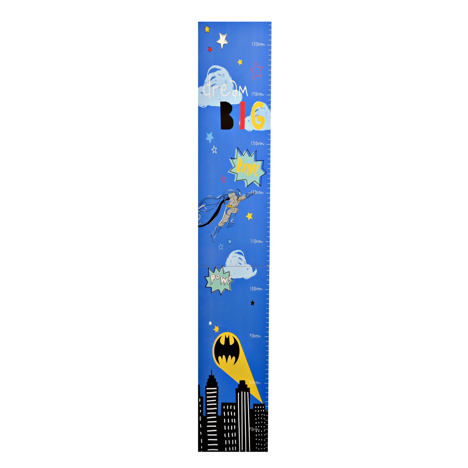 A Batman height chart from WARNER BROS. This vibrant height chart is a wonderful means of charting growth and watching little heroes get bigger. The wooden chart showcases a bright, matt blue finish, complete with a night-time scene featuring Batman and ‘Dream Big’ title. It is designed for wall hanging using the rear attachment. The chart is packaged in a white box with 4C sticker on back of product.