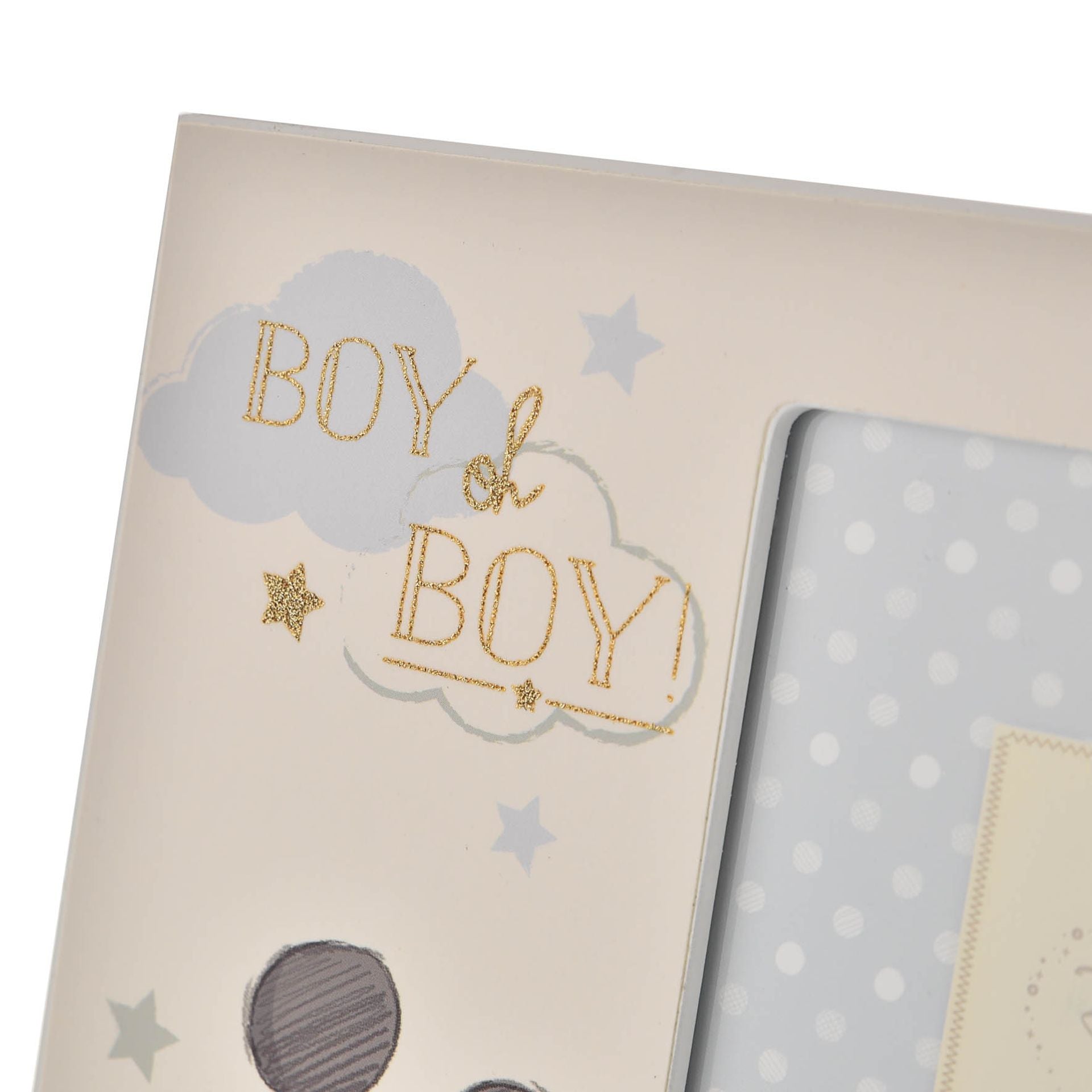 A Mickey photo frame from DISNEY. This adorable Magical Beginnings frame makes a treasured keepsake designed with baby sons in mind. It displays a beautifully printed image of the much-loved Mickey Mouse, complete with ‘Boy oh boy’ sentiment in gold lettering. The freestanding frame features a single portrait aperture and would make a delightful gift for those who have recently welcomed a new bundle of joy into their home. The frame is packaged in a Disney foiled closed box.