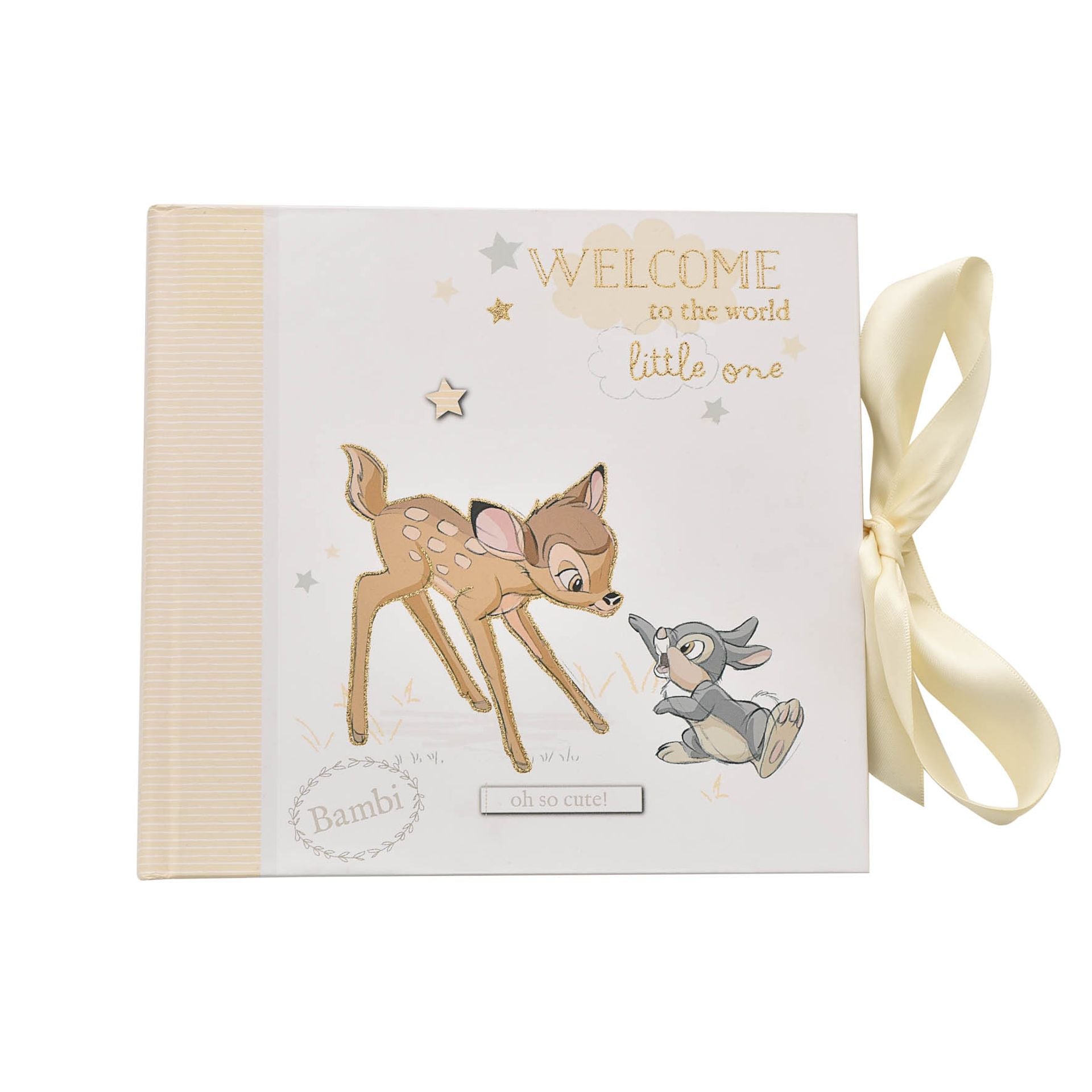 A Bambi photo album from DISNEY. This Magical Beginnings photo album adds a touch of magic to your every day and is a must-have for new parents. The album displays beautifully printed images of Bambi and Thumper, complete with 'Life’s an adventure' sentiment in gold glitter lettering on the front cover. It holds space for fifty photographs, features a completable title page and is finished with an ivory satin bow closure. The album is packaged in a Disney foiled closed box.
