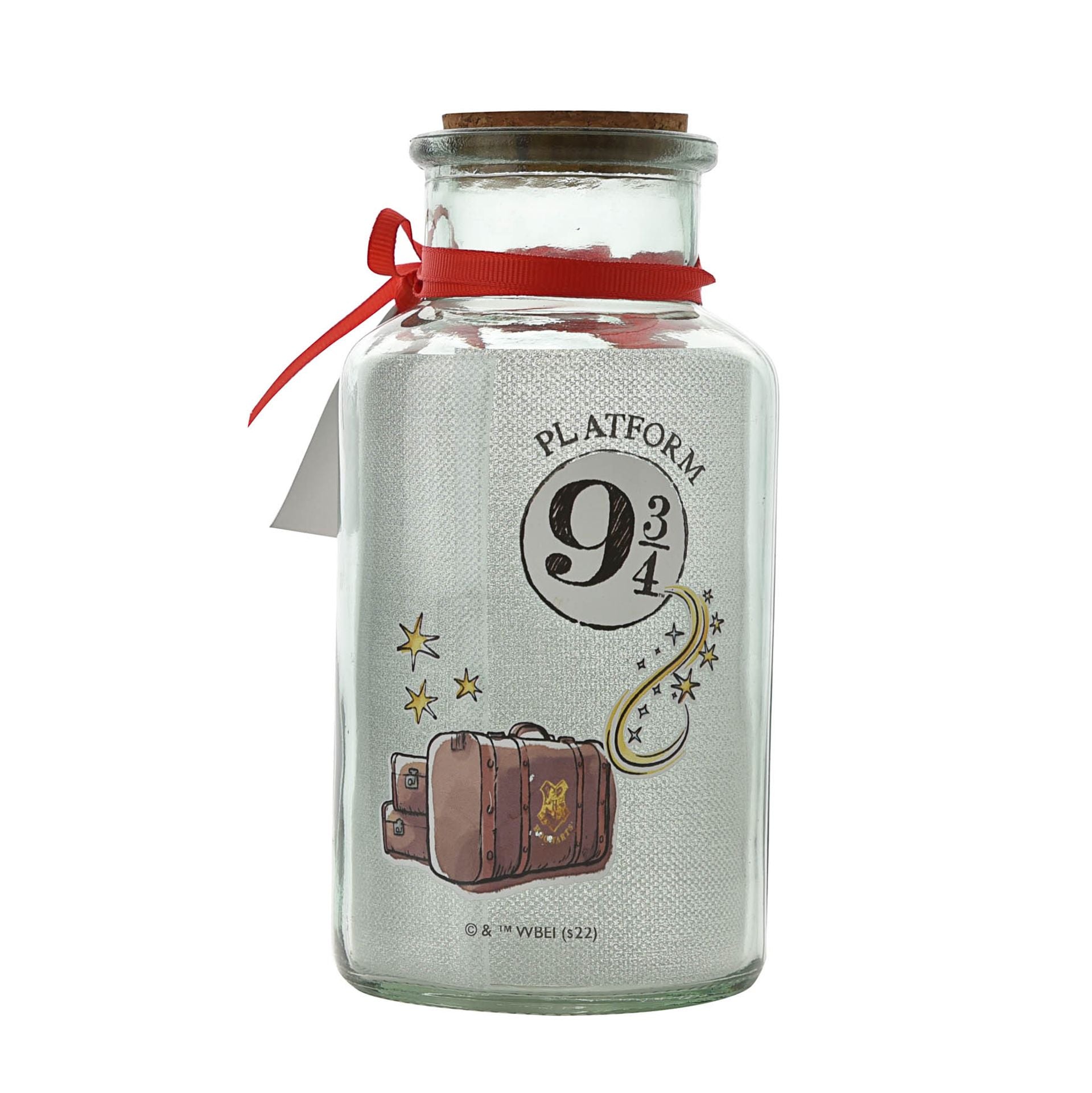 A Harry Potter light up jar by WARNER BROS. This attractive light up jar will watch over young wizards with help from the Hogwarts Express. The glass jar features a frosted appearance, complete with a large, printed image of the Hogwarts Express. It is closed with a cork bung and finished with a red ribbon around the neck which has a train ticket attached to it. The jar is packaged with a hang tag.