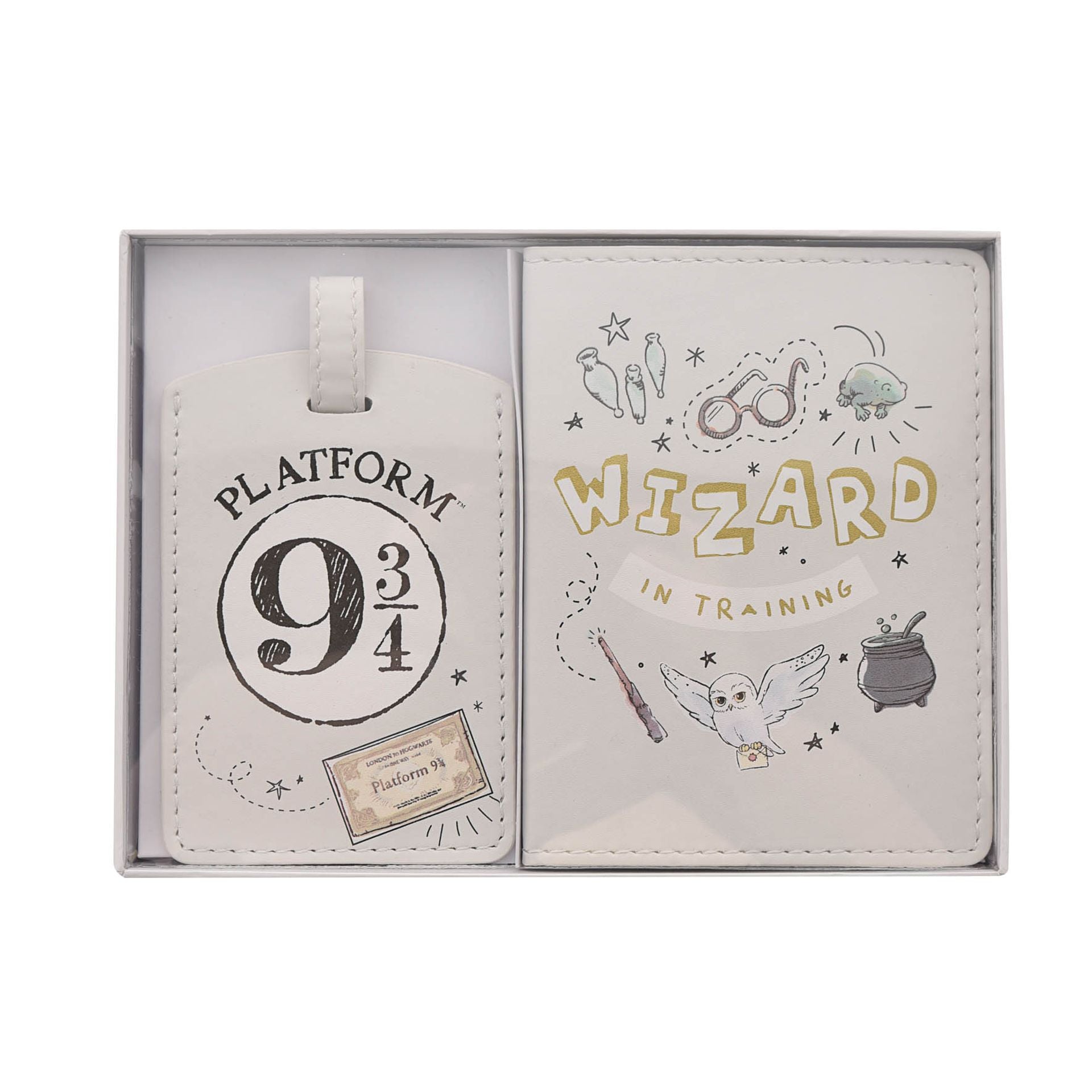 A Harry Potter passport holder and luggage tag set from WARNER BROS. This desirable travel set will add to the excitement of holidaying for little wizards. The grey leatherette set consists of a passport holder and luggage tag with individual pencil sketch style Harry Potter designs. The passport holder features ‘Wizard in Training’ gold lettering, alongside various magical images, whilst the luggage tag presents wonderful images of a train ticket and the Platform 9 ¾ sign. The set is packaged with a PET lid/colour base.