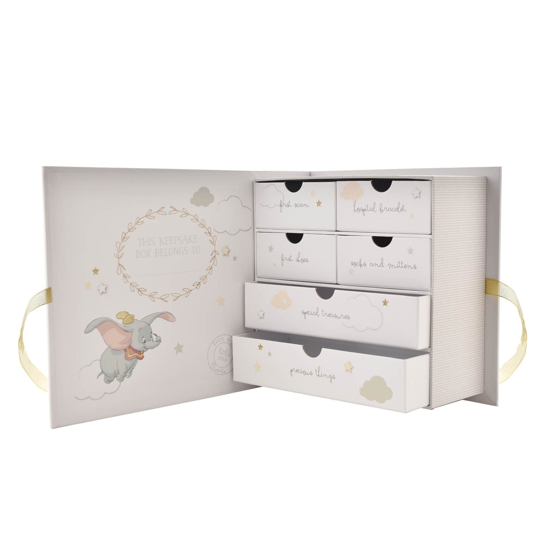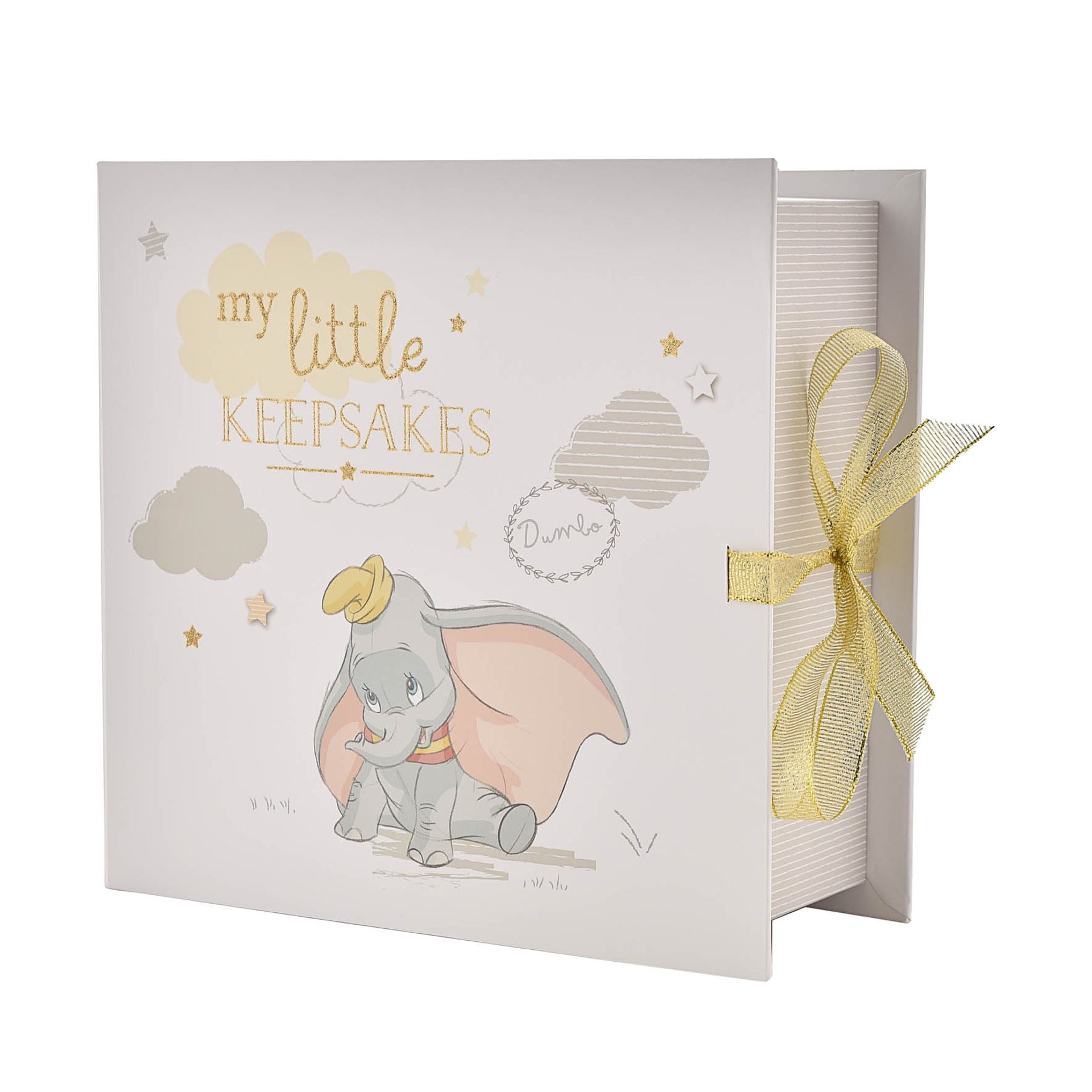 A Dumbo keepsake box from DISNEY. This keepsake box from Magical Beginnings is a beautifully sentimental memento designed with new-borns in mind. Its front cover features an adorable, printed image of Dumbo, complete with ‘My little keepsakes’ sentiment in gold glitter lettering and enhanced by a further image accompanying the ‘This keepsake box belongs to’ wording on the inside cover. Within the box are six cardboard drawers, each labelled with a tailor-made place to store treasured mementos and finished with soft pastel decorative patterns throughout, alongside a matching gold ribbon closer. The keepsake box is packaged in a branded sleeve.