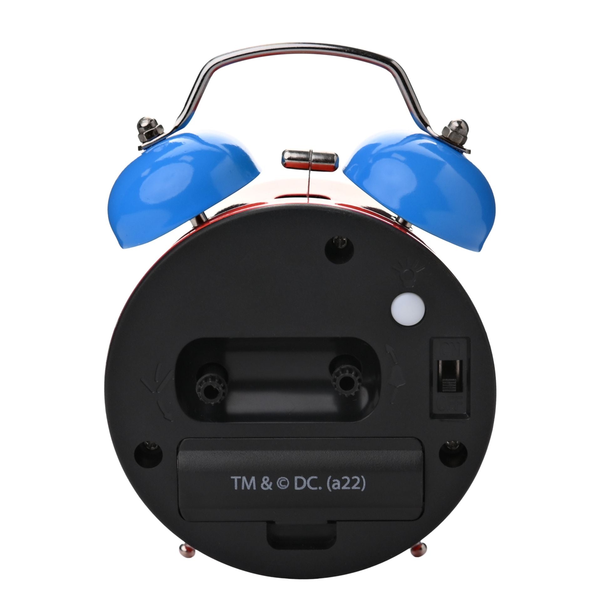 A Superman alarm clock by WARNER BROS. This vibrant alarm clock is a smile-raising gift for the bedroom of little superheroes. The traditional alarm clock stands out with its bright red iron frame and shiny blue bells. The Arabic clock face features a comic book style Superman design which is enhanced by yellow, plastic spade clock hands and white numbers. The clock is packaged in a 4c window box.
