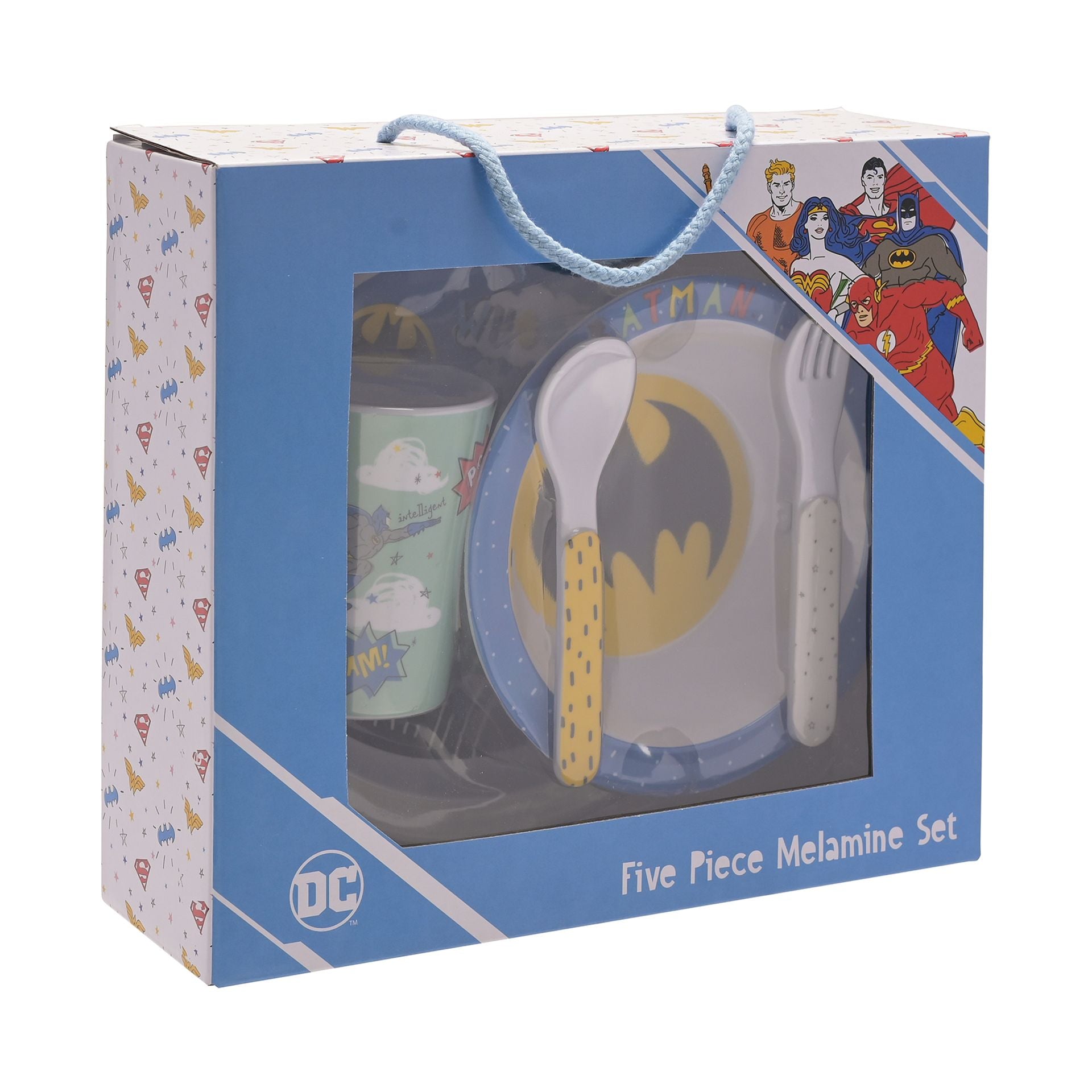 A Batman melamine dinner set from WARNER BROS. This vibrant dinner set is sure to make mealtimes fun for superhero fanatics The hardwearing set includes a dinner plate, bowl, cup, fork and spoon, all of which feature fantastic comic book designs featuring ‘the caped crusader’. A variety of eye-catching colours are on display across the dinnerware. The set is packaged in a 4c window box.